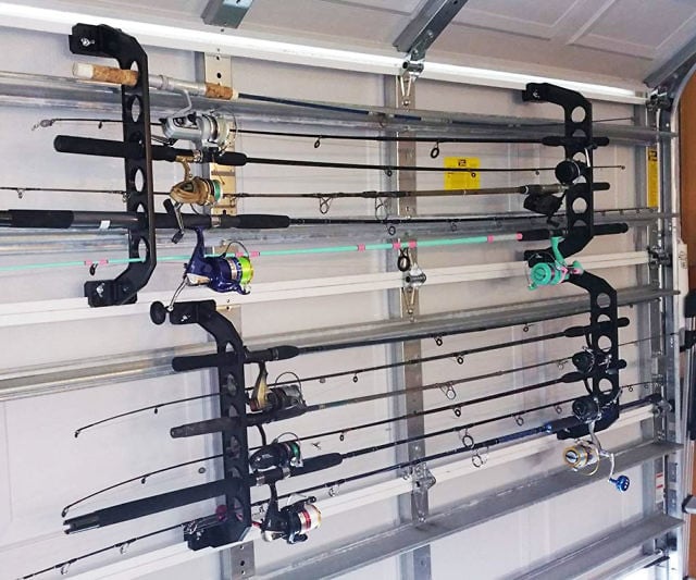 Free up floor space with a rack that mounts to a standard four‑panel garage door. Its hooks and loops hold fishing poles, rakes and other gear securely overhead.