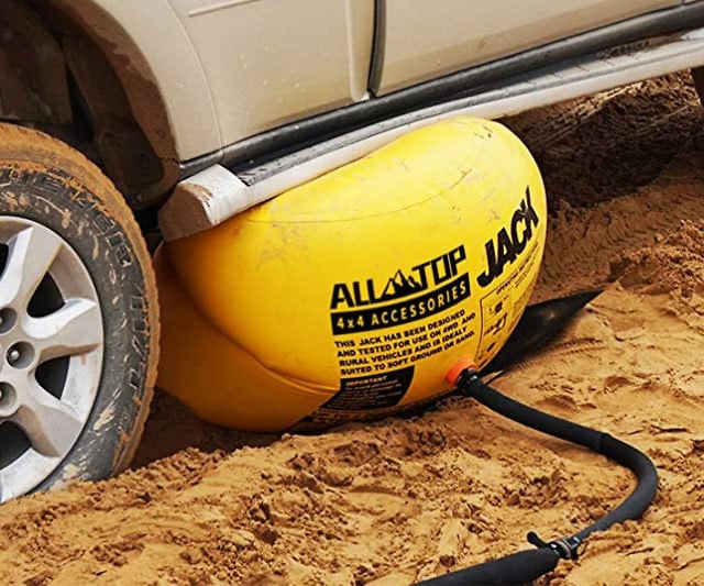 Lift your vehicle anywhere with this inflatable car jack. Attach the hose to your exhaust and the heavy-duty bag inflates to raise up to 8,800 pounds safely off the ground for tire changes and repairs.