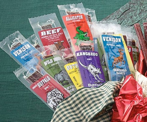 Sample exotic meats with a jerky sampler featuring flavors beyond beef—because why not snack on elk, boar, and kangaroo?