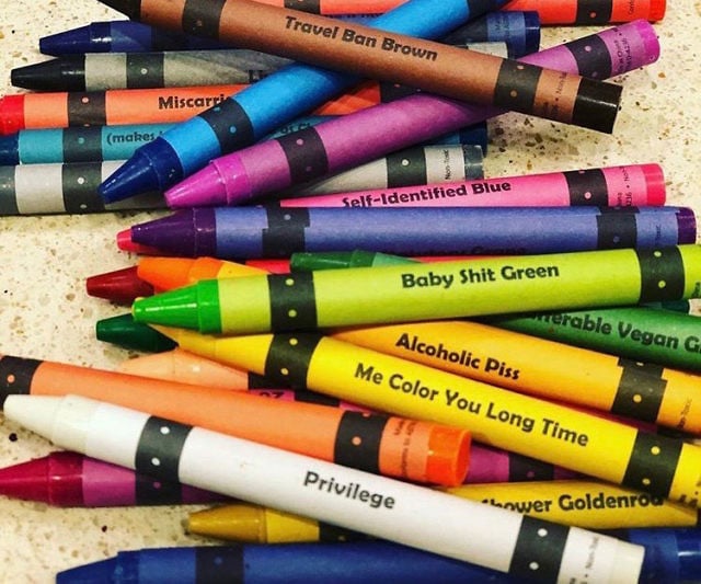 Unleash your inner scoundrel and give your creations an unprecedented edge using these delightfully offensive coloring tools. A collection of 24 crayons is included in every box, each boasting a completely unsuitable moniker such as “privilege white,” “insufferable vegan green,” “travel ban brown,” and “miscarriage maroon.”