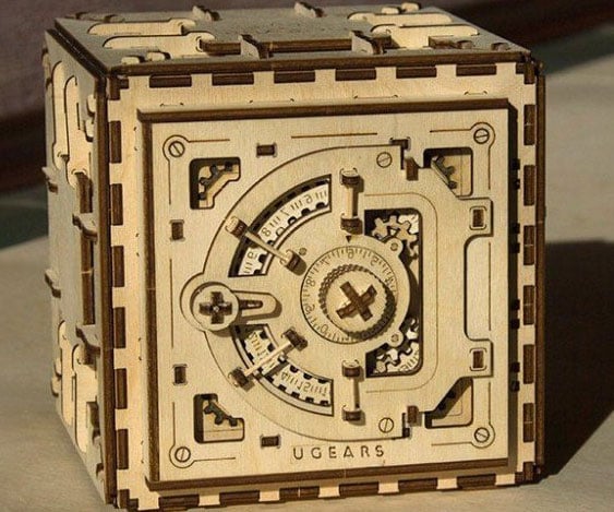 Guard your treasures from sticky fingers without breaking the bank on protection by tucking them away in this mechanical DIY safe. This plywood security box arrives as 179 precisely cut components, ready for you to construct a compact, cubical safe featuring its own 3-digit combination lock.