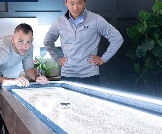 Keep the games going after dark with this LED‑lit shuffleboard. Rustic woodgrain meets glowing rails and a polished play surface that’s ideal for shuffleboard or bowling, turning your game room into an illuminated arcade.