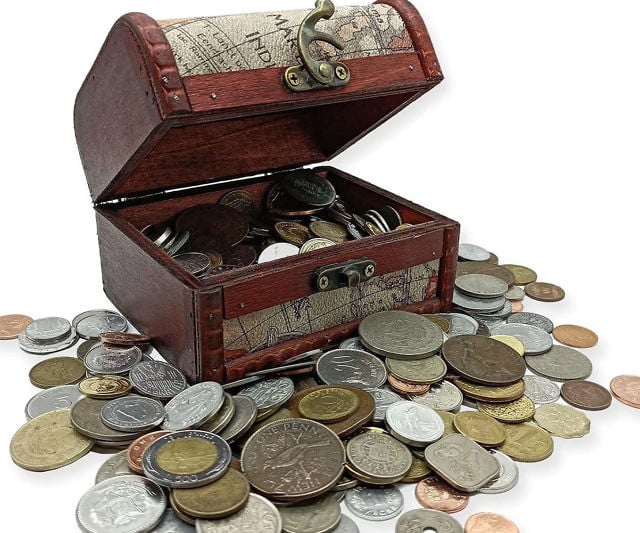 Unearth a centuries-spanning saga contained within this coin-laden treasure chest, a fascinating historical haul. This decorative wooden coffer arrives brimming with a diverse, hand-selected assortment of uncommon coinage, representing three distinct centuries and six global landmasses.