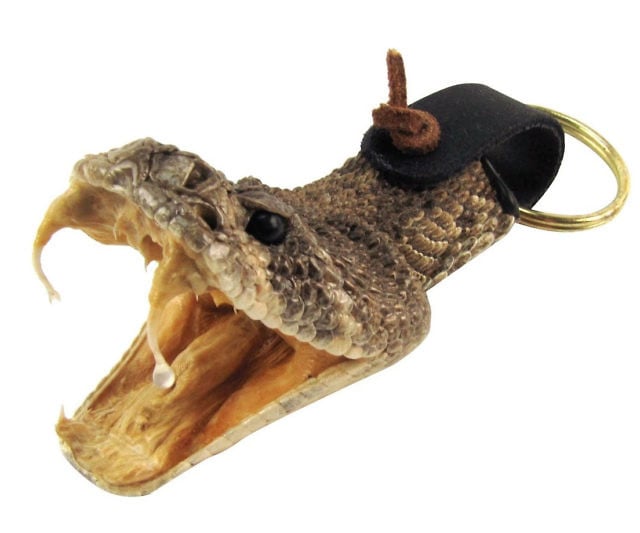 Ensure your keys are never misplaced again by hitching them to this formidable diamondback rattlesnake head fob. This delightful talking point, fashioned from a genuine rattlesnake, is meticulously handcrafted and measures approximately three inches long by one and a half inches tall.