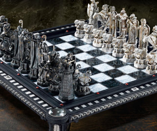 Bring the legendary Sorcerer's Stone chess match to your abode with this Harry Potter chess set. The full complement of 32 pieces are meticulously sculpted, mirroring the fantastical beasts featured on the authentic Hogwarts chess board.