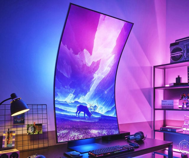 Go ahead, upgrade your setup with the Samsung Odyssey Ark 55" curved display and prepare for total immersion, whether you're grinding away or just kicking back. This 55-inch beauty sports a 16:9 aspect ratio and a seriously deep 1000R curve, all perched atop a height-adjustable stand that's cheeky enough to pivot a full 90 degrees skyward.