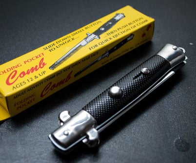 Deploy this comb with style, channeling your inner rebel. When this slick item is produced, onlookers may initially assume a confrontation is imminent, but a quick flick of the mechanism reveals a refined comb, prompting universal admiration for your undeniable coolness.