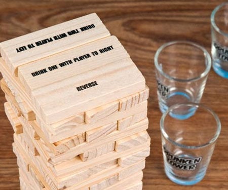 Elevate your next boozy gathering with this spirited stacking challenge, a tipsy take on the classic tower game. Every piece features a concise directive, dictating the quantity of drink to be downed by you and those nearby as you carefully extract the blocks.