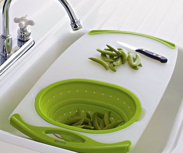 Because this cutting board sits right over your sink, prepping produce for a rinse and strain is now delightfully simple. This clever cutting board is safe for the dishwasher, sports non-slip edges, and includes a handy integrated collapsible silicone strainer capable of holding two and a half quarts.