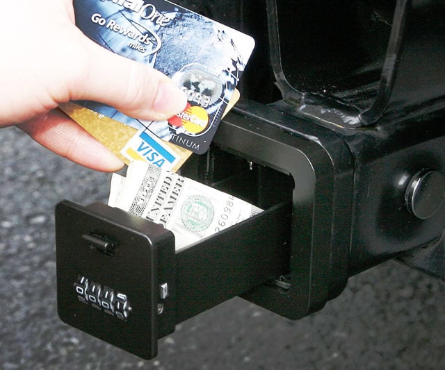 Stash your treasures safely, yet conspicuously, within this towing hitch's secret compartment. This entirely metallic strongbox boasts a robust, straightforward build, allowing for swift, tool-free mounting and removal at your convenience.