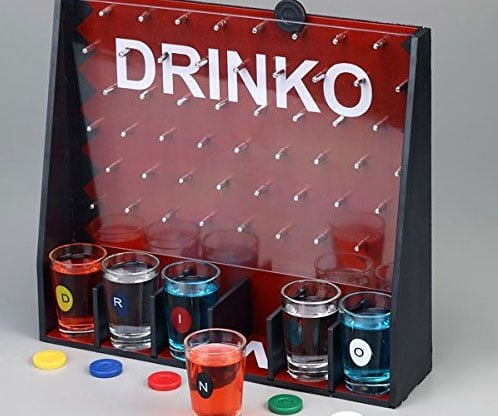 Dare to challenge fate and your fortitude with a spirited session of DRINKO. Participants launch a petite token down the studded course, where numerous pegs direct its descent toward one of the six waiting shot glasses positioned below.