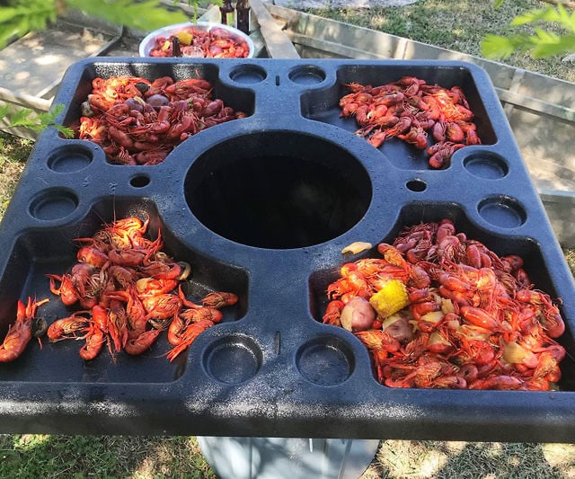 Elevate your upcoming crawfish extravaganza to legendary status courtesy of this purpose-built tabletop. This substantial 40" x 40" platter comfortably accommodates eight and features four generous serving sections alongside eight integrated cup holders, rendering it perfectly suited for your next barbecue or any open-air culinary gathering.