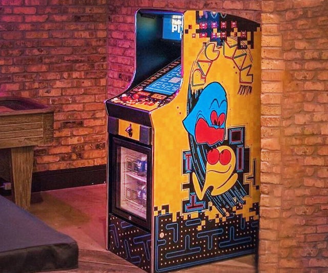 Elevate your space with a significant refresh courtesy of this Pac-Man arcade and beverage chiller unit. The upper section of the apparatus presents a completely operational Pac-Man Pixel Bash arcade game, while the bottom portion contains a fully functional compact refrigerator.