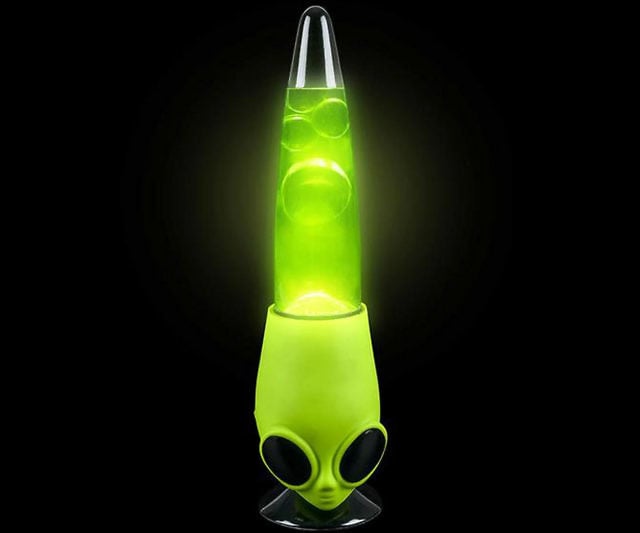 Illuminate your space with a cosmically chic touch using this alien head lava lamp. This captivating, 13-inch tall conversation starter radiates a vibrant neon green light, injecting charm, a bit of humor, and overall atmosphere into your environment.