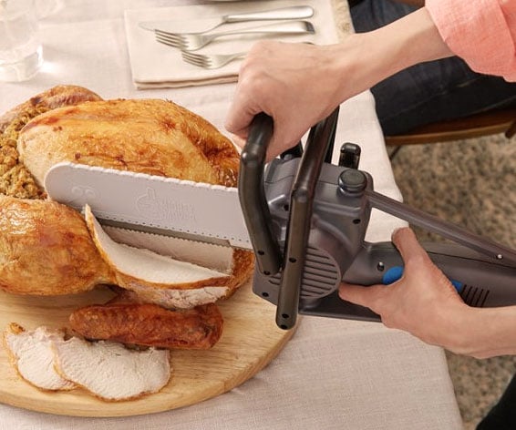 For this year's feast, put away the precious cutlery and tackle that magnificent bird with this electric chainsaw turkey carving knife. This electric, chainsaw-styled slicer boasts incredibly sharp stainless steel blades paired with a comfortable, contoured handle for a firm, unwavering hold.