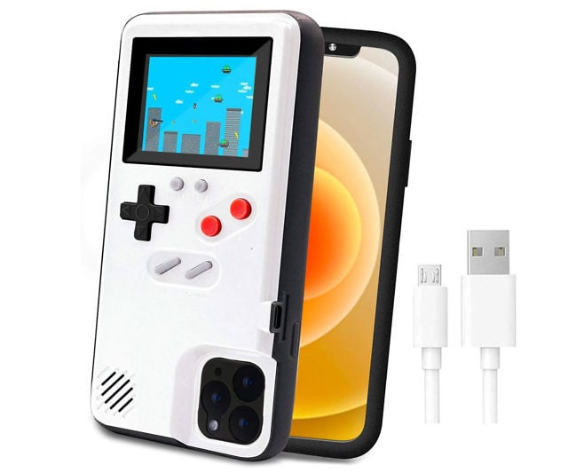 Protect your phone and cure boredom with this game-console case. The shockproof design wraps your iPhone in a sturdy shell while the back houses a self‑powered, handheld game screen reminiscent of a classic Game Boy.
