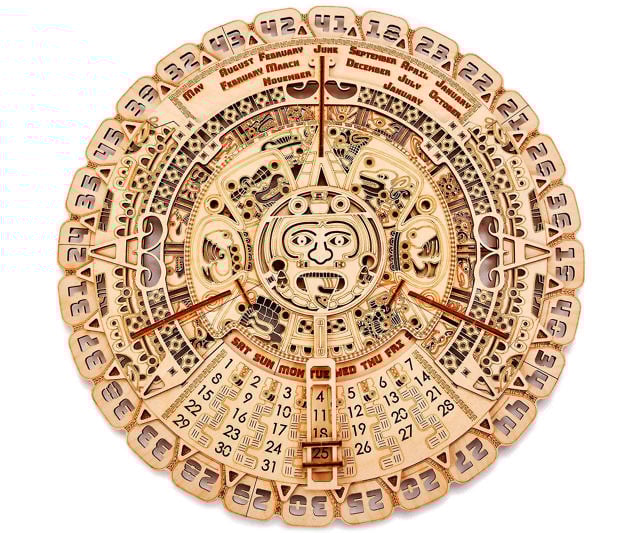 Mark time the ancient way with this mechanical Mayan calendar puzzle. Crafted from natural birch, its 73 pieces fit together to create a wall‑mounted calendar that you rotate by hand to track the days.