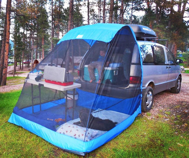 Transform your SUV into a mobile cabin with this universal tent. It attaches to the rear hatch of most small SUVs and minivans to create a sheltered sleeping area complete with bug‑screened door.