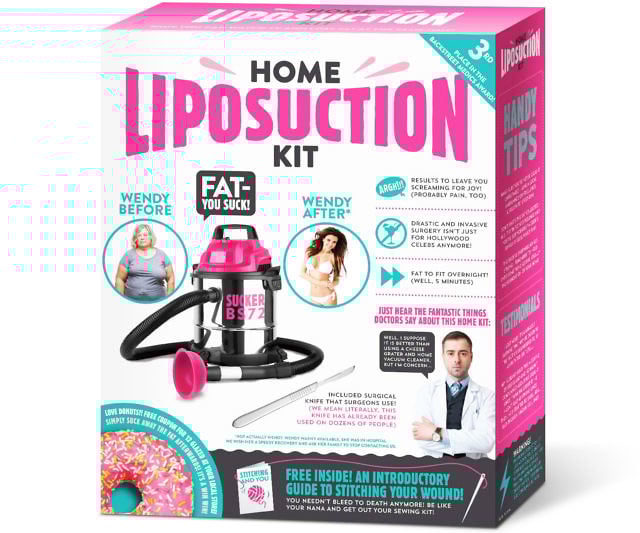 Lose inches the horror way with this tongue-in-cheek Home Liposuction Kit. Complete with a scalpel and sutures, it’s strictly a prank gift that satirizes extreme DIY trends—please leave fat removal to the pros.