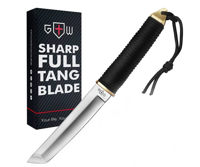 Channel samurai precision with a full tang tanto knife. It features a sharp carbon steel blade, a hardwood handle wrapped in cord, and a lacquered sheath for secure carry.