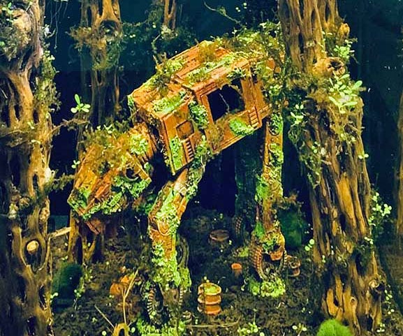 Turn your fish tank into Hoth with a resin AT‑AT walker. The miniature walker lies in ruin, creating a habitat for fish while satisfying Star Wars fans.