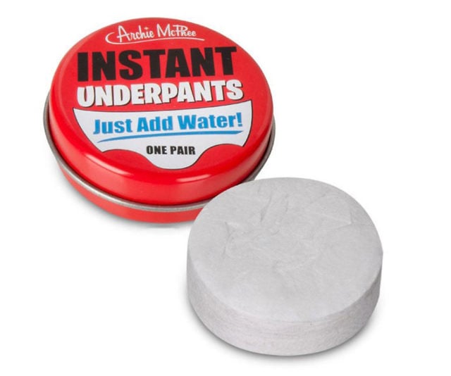 Carry spare underwear in your pocket with these compressed instant underpants. Just add water and watch them expand into a pair of cotton boxers—lifesaver or gag gift.