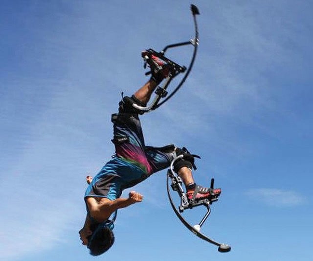 Bounce up to 12 feet high with spring-loaded stilts. Adjustable straps fit most adults, letting you run, jump, and perform tricks like a superhero.