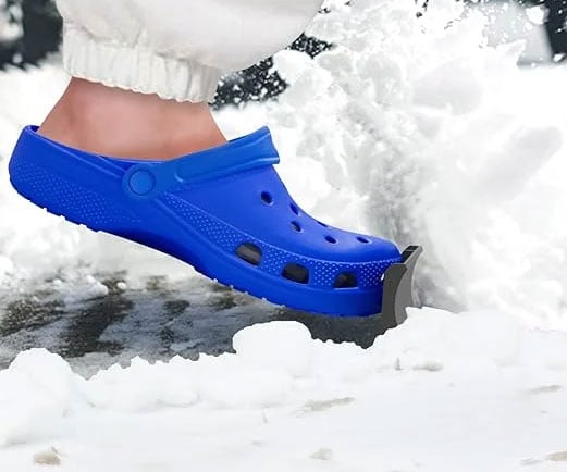 Clear sidewalks in your Crocs by attaching mini plow blades to your toes, turning your footwear into winter tools.