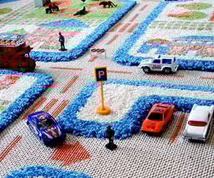 Encourage imaginative play on a large 3D rug depicting a town complete with raised roads, hills and buildings.
