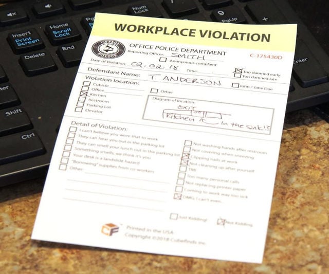 Keep your office antics in check and the productivity flowing with these delightfully cheeky workplace violation sticky notes! They're the perfect passive-aggressive (but mostly just fun) way to gently nudge your colleagues back into line when their behavior starts veering off the professional path. You can now effortlessly call out those pesky, everyday infractions—think the egregious offense of "not covering when sneezing" or the time-sucking tragedy of "too many personal calls"—with a sticky note that gets the point across without needing an awkward confrontation. Consider them your secret weapon for maintaining order and addressing a whole host of common office misdemeanors with a wink and a firmly affixed piece of paper.