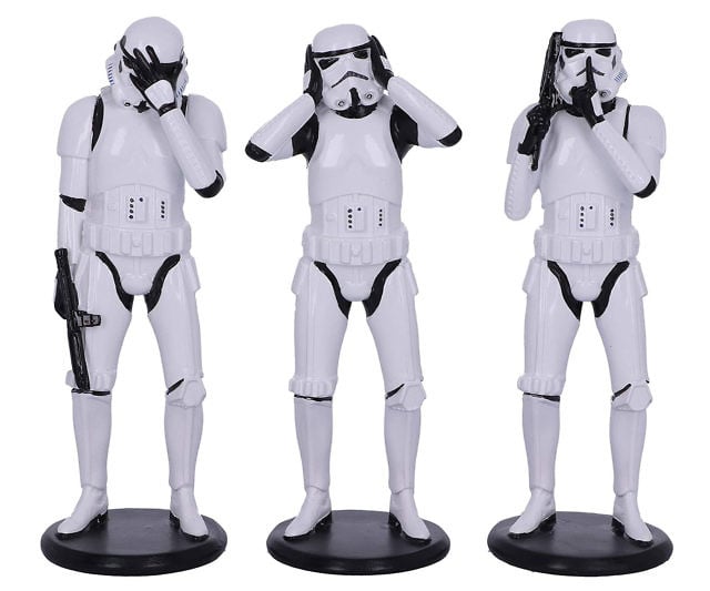 A Star Wars twist on the classic nativity scene: three stormtroopers depict 'see no evil, hear no evil, speak no evil,' bringing nerdy charm to your shelf.