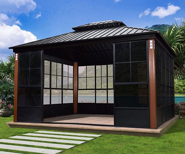 Transform your deck into an all-season retreat with this hardtop gazebo. Its rustproof steel frame and polycarbonate roof provide shade and shelter, while built-in hooks for lights or curtains let you customize the ambience for dining or lounging.