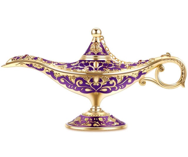 Hold a bit of Agrabah in your hands with this ornate metal lamp. Its hinged lid and intricate engravings invite you to make wishes—though the only thing that emerges is conversation about its gorgeous craftsmanship.